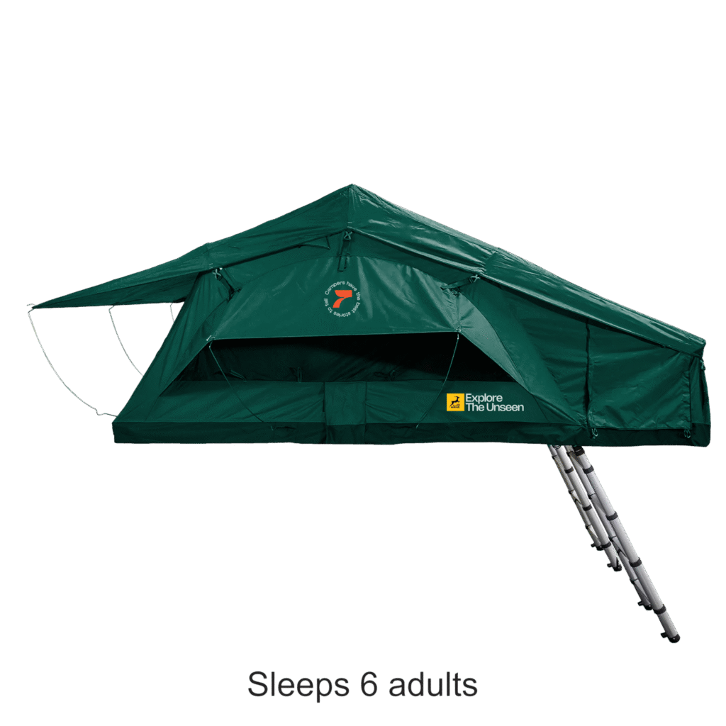 Biggest Roof Top Tent Soft-Shell for 6 adults, the Walkabout series offers LST, huge side windows, massive bed comfort, and easy setup for all the crew.